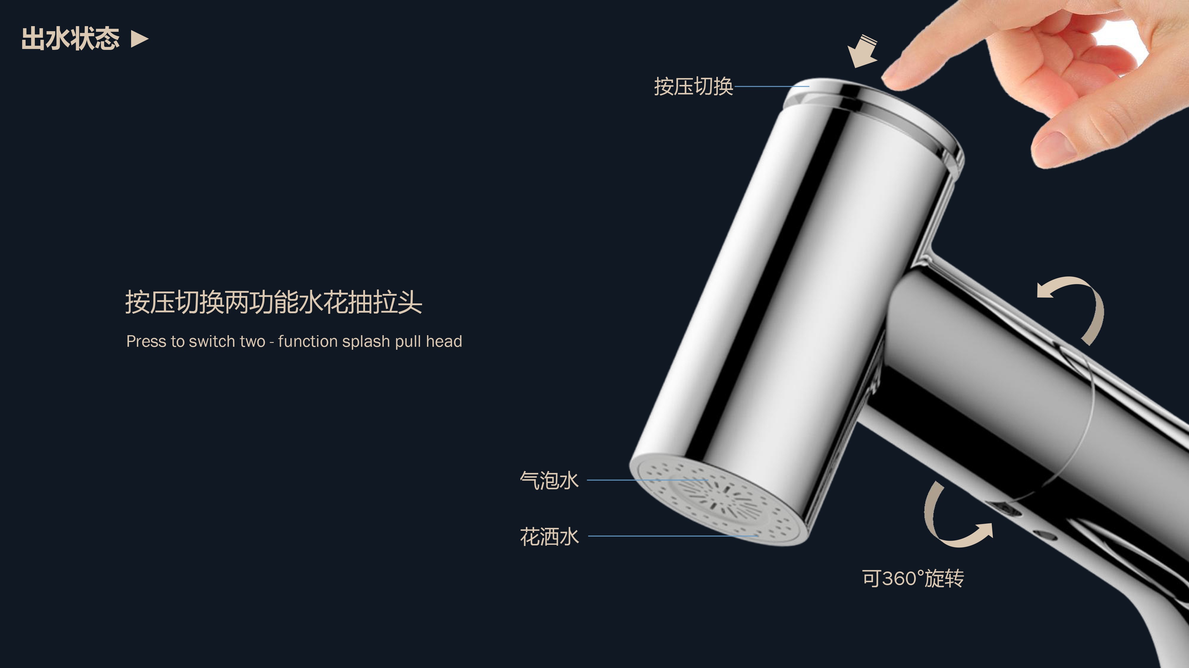 360°全方位抽拉清洗;微光龍頭,深夜使用不開大燈,不刺眼;日常洗頭利器,抽拉出水輕松洗;按壓切換兩功能水花;三種顏色LED燈光顯示水溫;重力錘復(fù)位設(shè)計(jì),順暢伸縮,精準(zhǔn)回位;無需工具,一推一擰10秒快裝