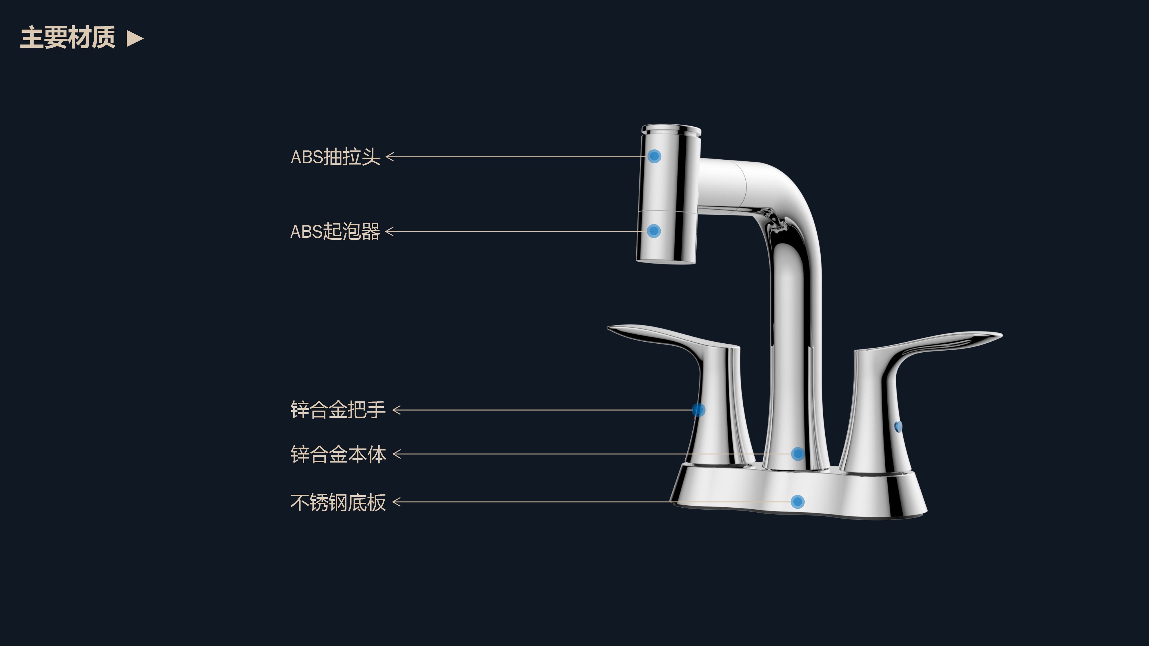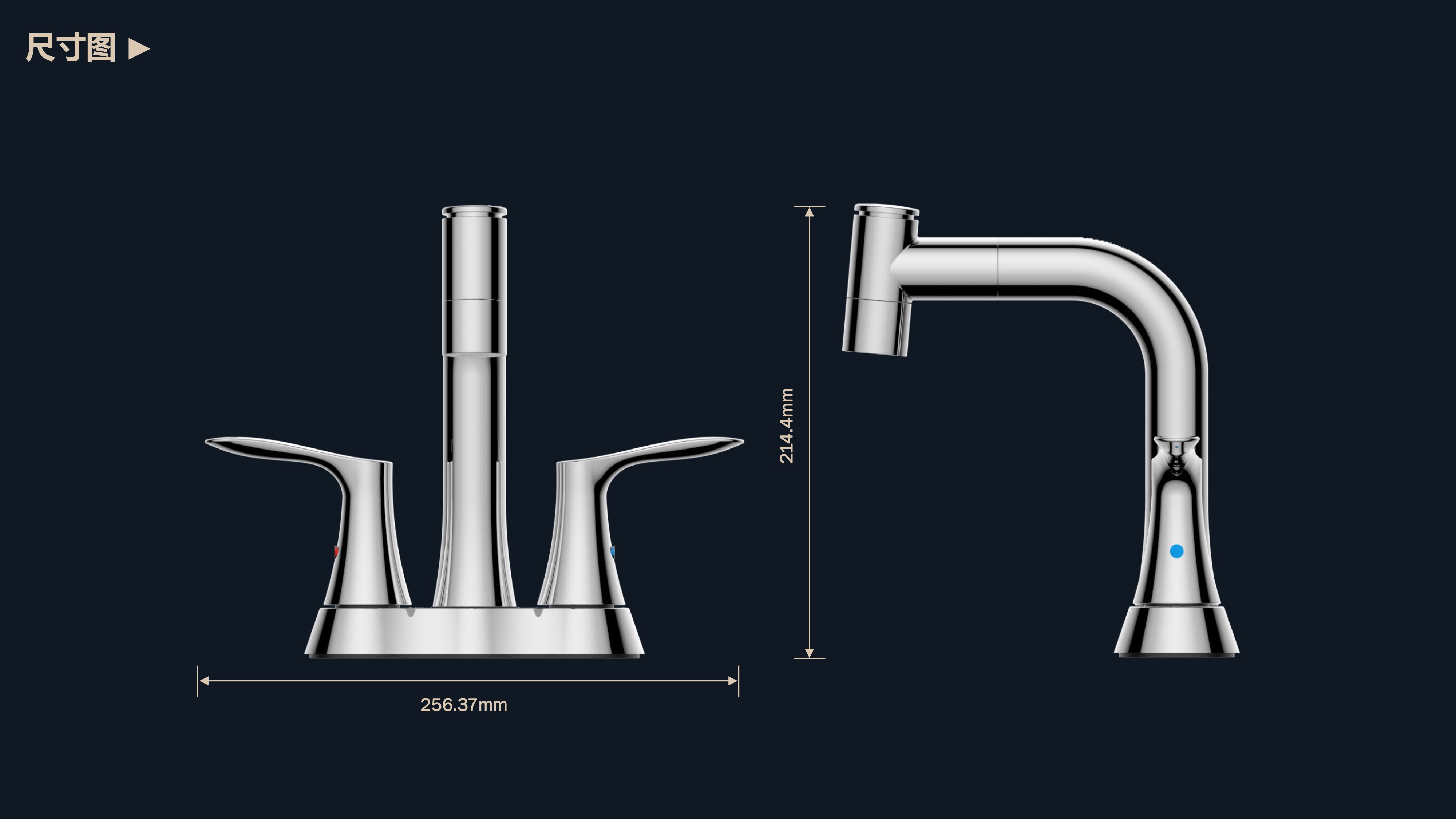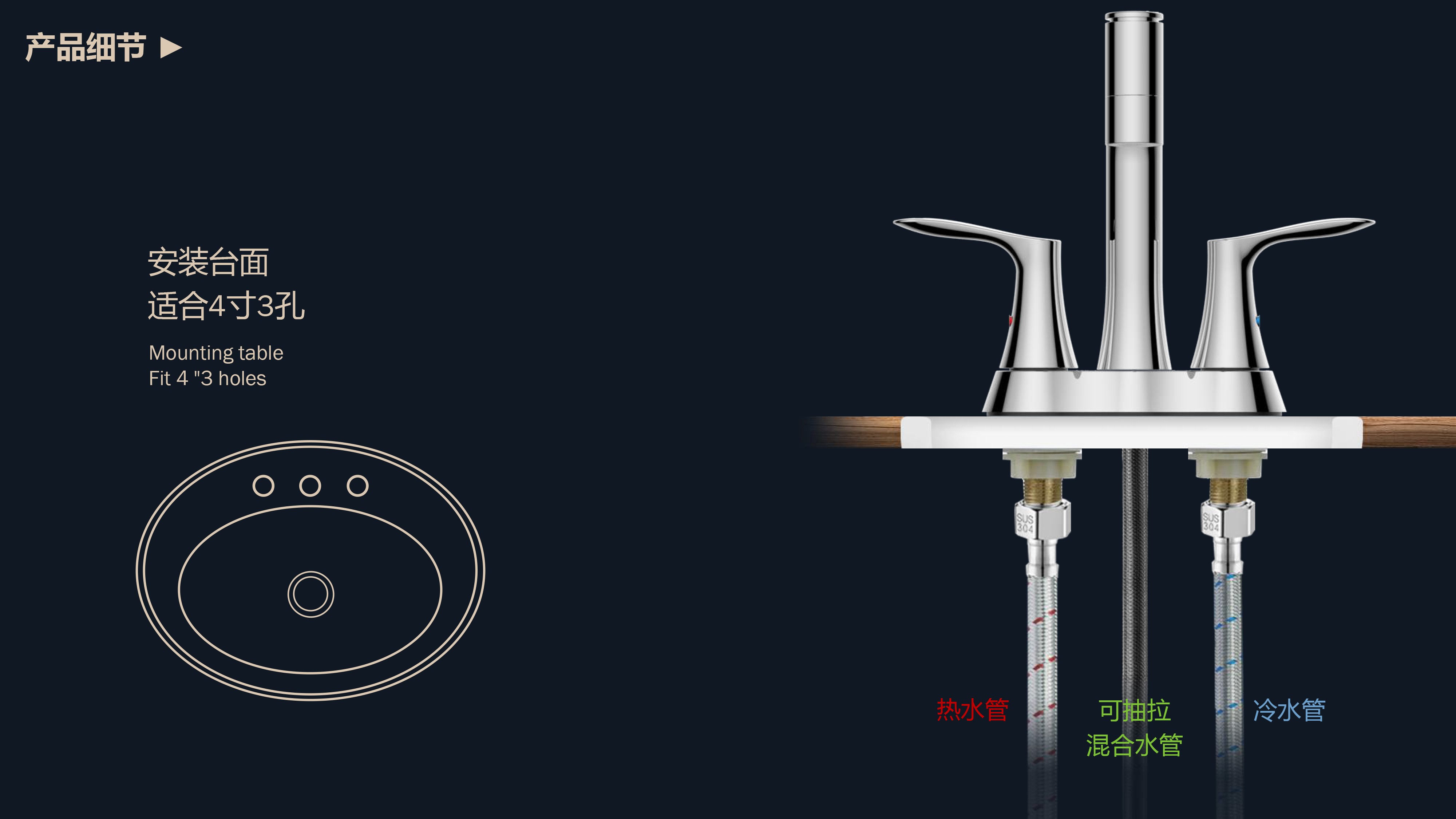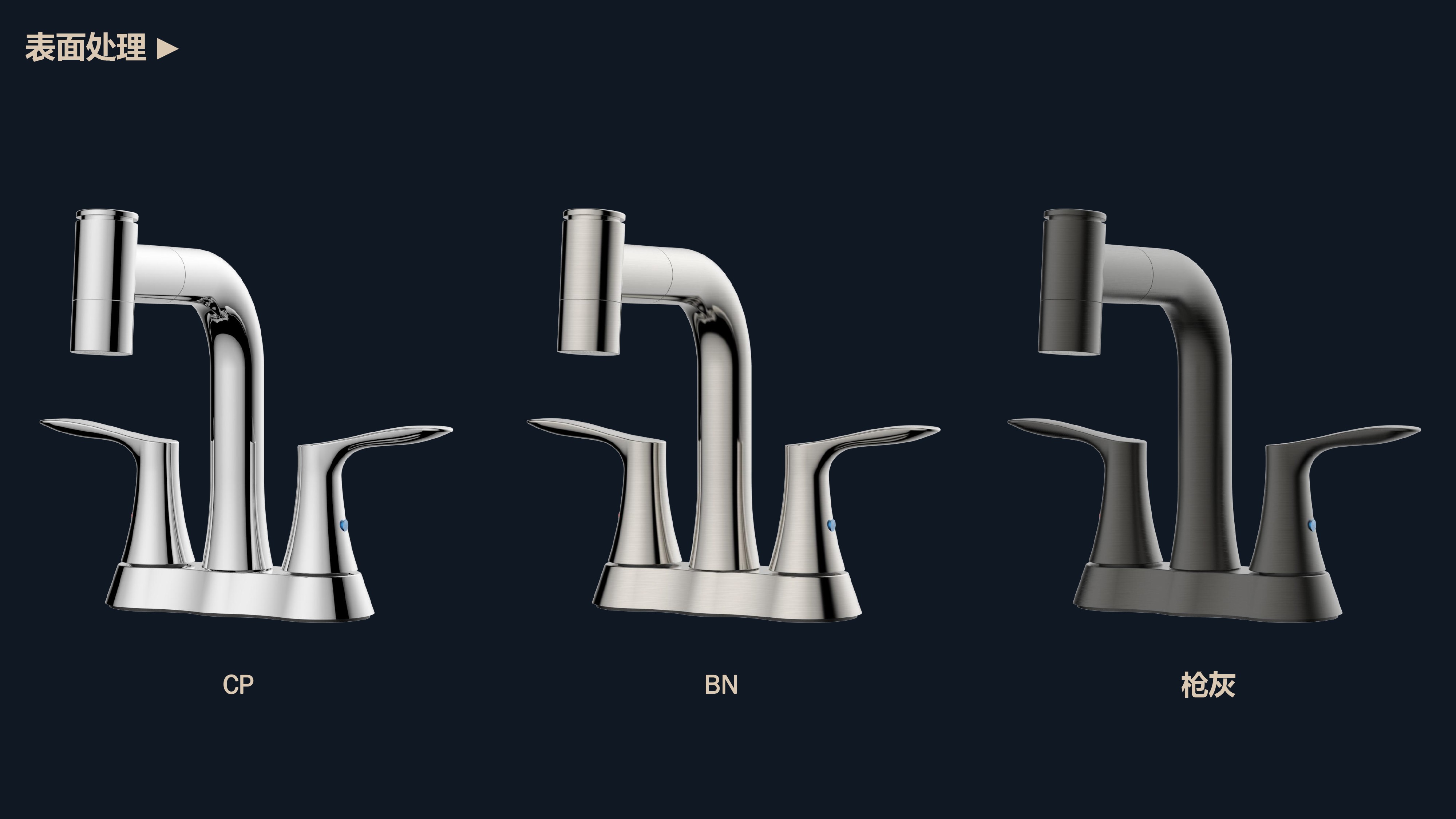 溫感三色LED燈光出水;日常洗頭利器,抽拉出水輕松洗;按壓切換兩功能水花;適合4寸3孔安裝臺(tái)面